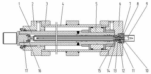 圖中:1-油缸活塞桿,2-油缸缸頭,3-油缸法蘭,4-油缸缸筒,5-油缸活塞, 6-油缸缸底,7-小油缸缸底,8-內(nèi)六角螺釘,9-傳感器,10-傳感器保護(hù)管組件,11-銅環(huán), 12-磁環(huán),13-小缸筒,14-小活塞桿,15-銅導(dǎo)向套,16-接連法蘭,17-油缸活塞桿桿頭。