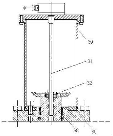 2)第二種油缸磁致伸縮位移傳感裝置如圖3所示,在油缸端蓋30上固定一支架筒39,在油缸活塞桿38的軸心設(shè)置軸向的中孔,位移傳感器的感應(yīng)磁環(huán)32固定在油缸活塞桿38的端面上,位移傳感器的芯桿31固定在支架筒39上,并穿過(guò)感應(yīng)磁環(huán)32后活動(dòng)插入油缸活塞桿38軸心的中孔,油缸運(yùn)動(dòng)時(shí),位移傳感器的感應(yīng)磁環(huán)32隨油缸活塞桿的伸縮做直線運(yùn)動(dòng),位移傳感器的芯桿31切割感應(yīng)磁環(huán)32勵(lì)磁,產(chǎn)生油缸的位移信號(hào)輸出給控制系統(tǒng),由控制系統(tǒng)據(jù)此信號(hào)來(lái)精確控制油缸的位移。